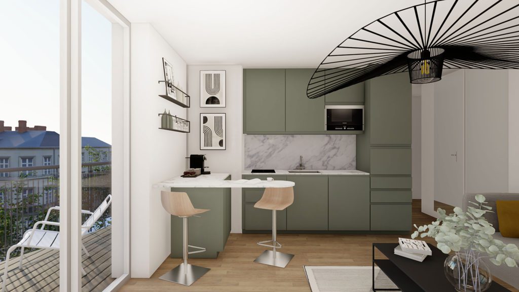 Une petite cuisine où rien ne manque avec un coin repas face à la terrasse pour profiter de la vue et de la lumière.