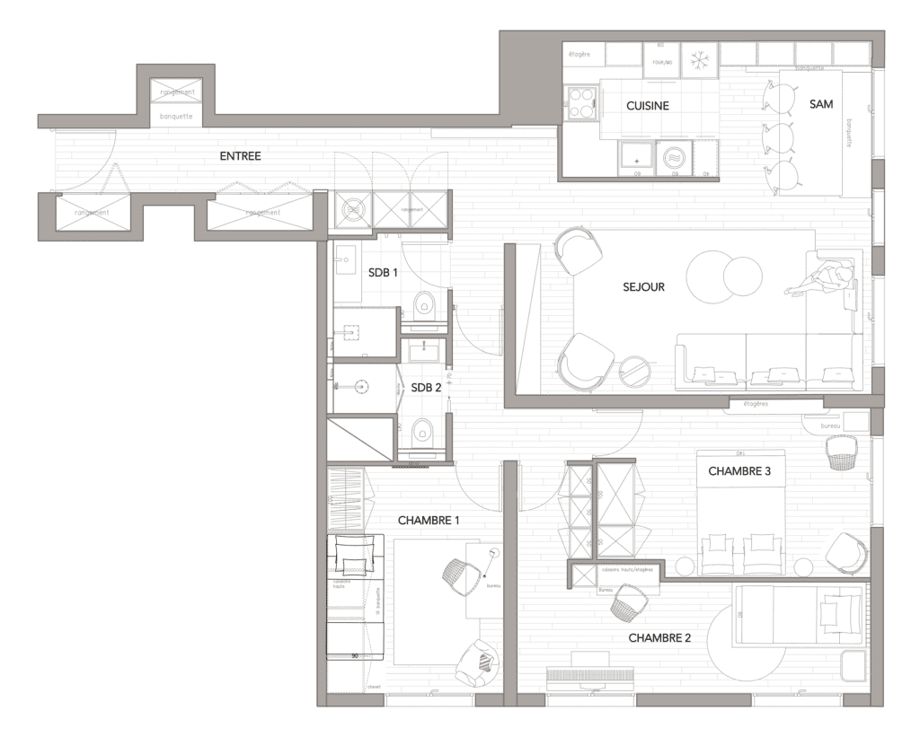 Le choix des matériaux, la gestion de la lumière naturelle et une palette de couleurs soigneusement étudiée renforcent l’équilibre entre modernité et convivialité. Chaque détail, du mobilier aux finitions, a été pensé pour allier esthétique et praticité, offrant ainsi un projet clé en main où chaque espace trouve sa juste place.