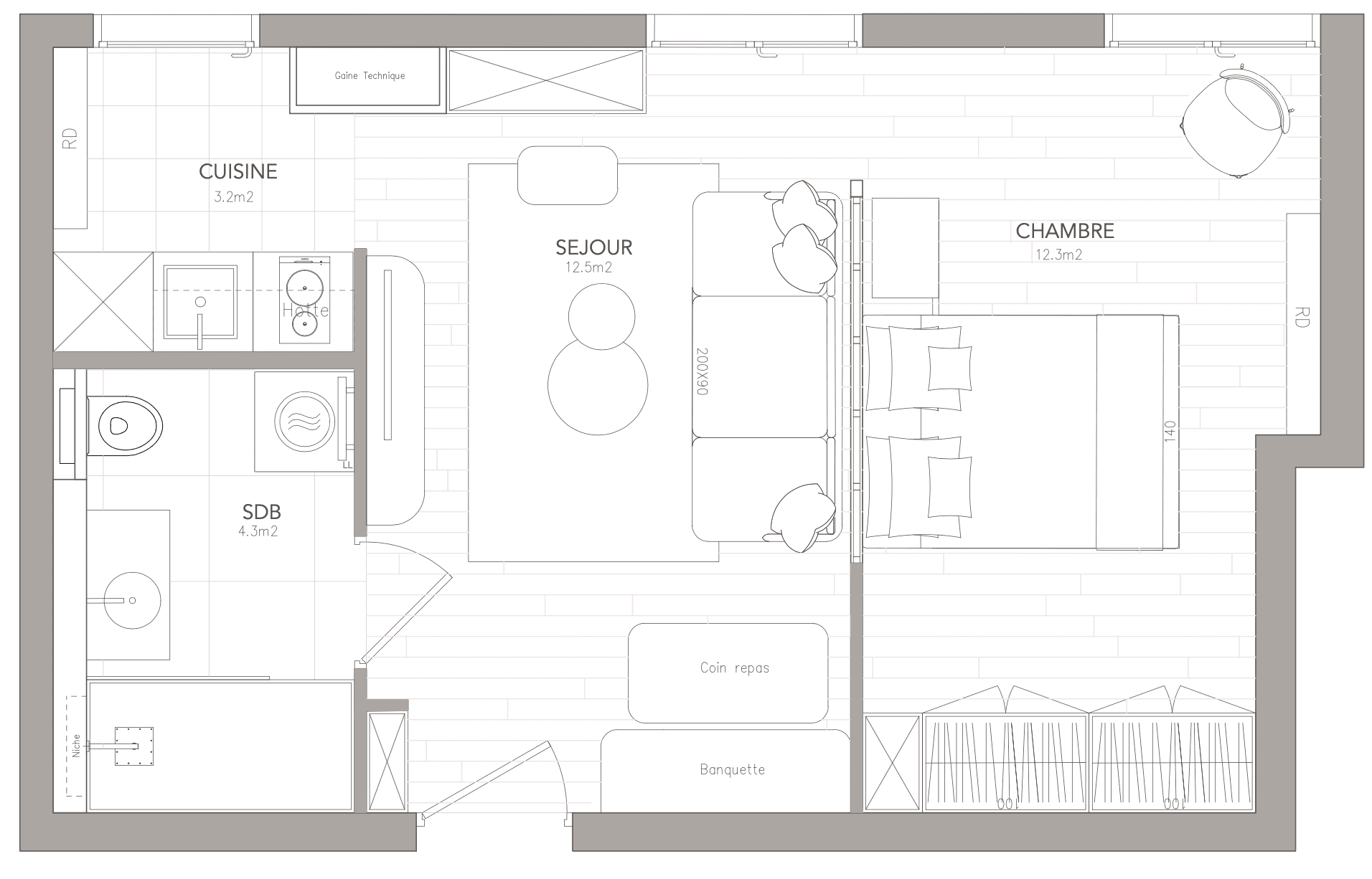Le séjour a été aménagé pour inclure un coin repas fonctionnel, parfait pour les petits déjeuners ou les repas rapides. Chaque détail a été pensé pour allier ergonomie et esthétique : la table de repas au plateau en marbre rose ajoute de l’élégance à cet espace tandis que la banquette intègre un coffre permettant de bénéficier de plus de rangements.